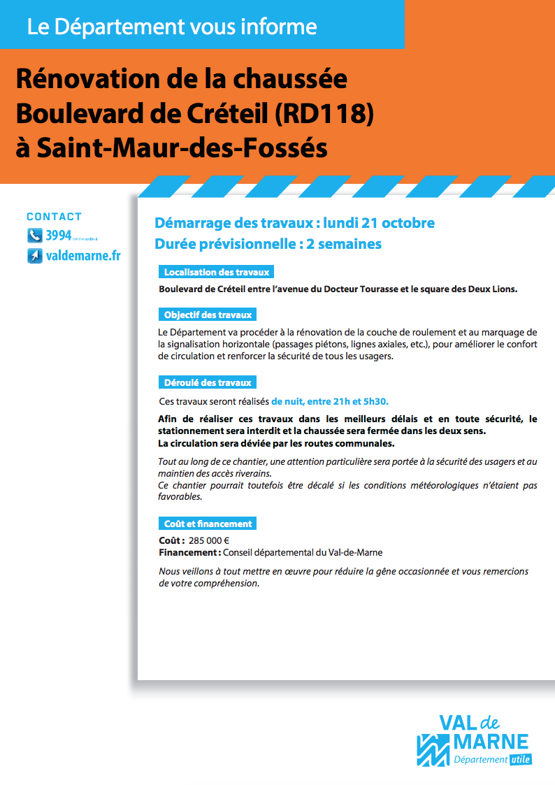 Le Département du Val-de-Marne nous informe que des travaux de rénovation de la chaussée sur le boulevard de Créteil auront lieu à partir du lundi 21 octobre.